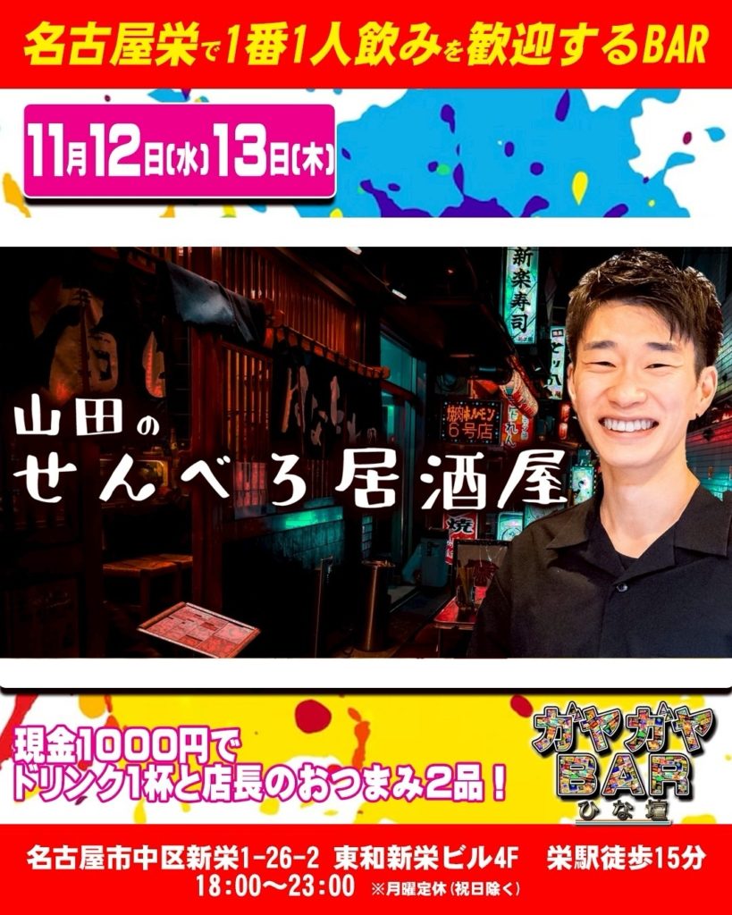【11/13】せんべろ居酒屋風企画!in 名古屋栄で1番1人飲みを歓迎するガヤガヤBAR