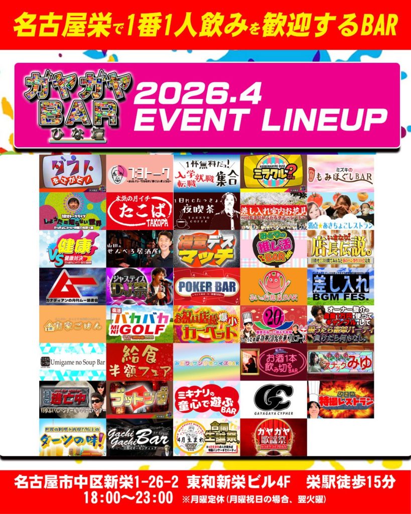 名古屋栄で1番一人飲みを歓迎するガヤガヤBARの4月のイベント決定!